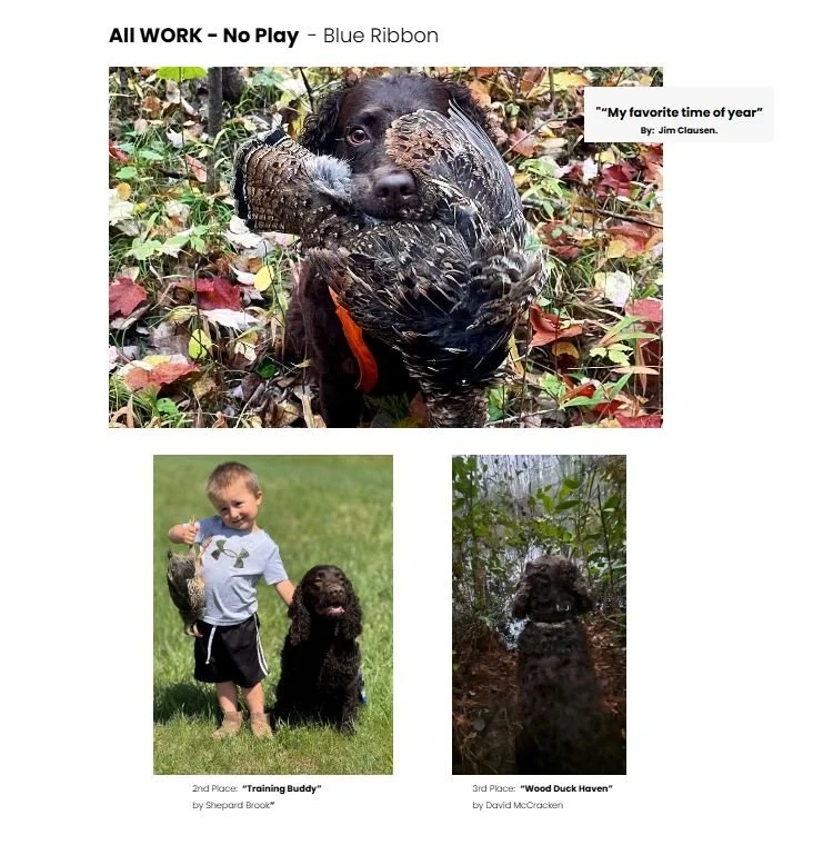 On Friday, the action started at the Wolf River Game Farm. A combination of AKC Spaniel and AWSC hunt tests enabled participants to obtain qualifying scores for their dogs. Handlers rotated through upland flushing tests, water retrieving tests, and land retrieving tests. We dealt with some thunderstorms on Saturday - but the delay went fast as everyone was enjoying each other’s company under cover, staying warm and dry.